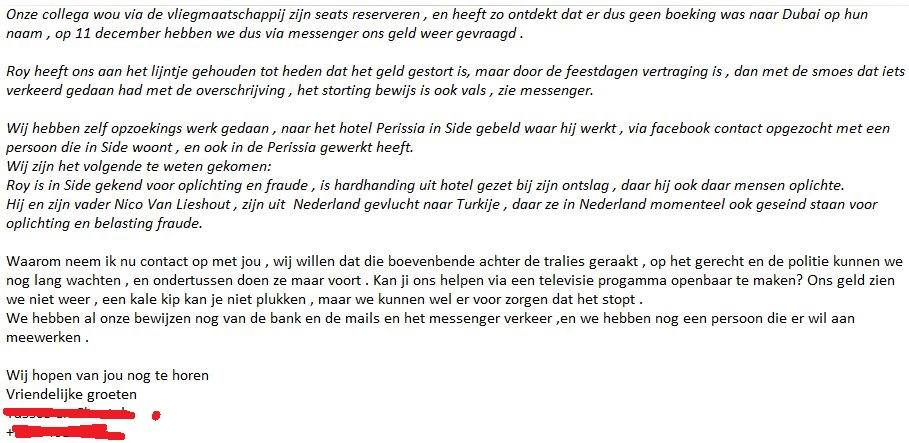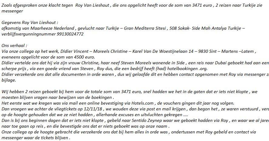 As agreed, our complaint against Roy Van Lieshout, who defrauded us for the sum of 3471 euros, 2 trips to Turkey, see messenger