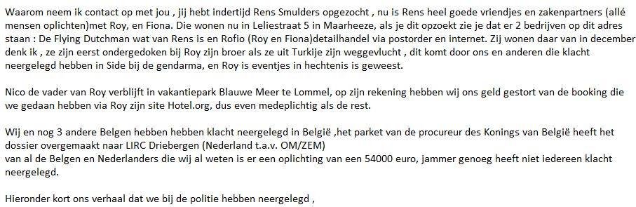 Why am I contacting you, you visited Rens Smulders at the time, now Rens is very good friends and business partners (scam all people) with Roy, and Fiona. They now live in Leliestraat 5 in Maarheeze, if you look this up you will see that there are 2 companies at this address: De Flying Dutchman which is van Rens and Rofio (Roy and Fiona) retail trade via mail order and internet. They have been living there since December I think, they first went into hiding with Roy's brother when they fled Turkey, this is because of us and others who have lodged a complaint in Side with the gendarma, and Roy has been in custody for a while.
